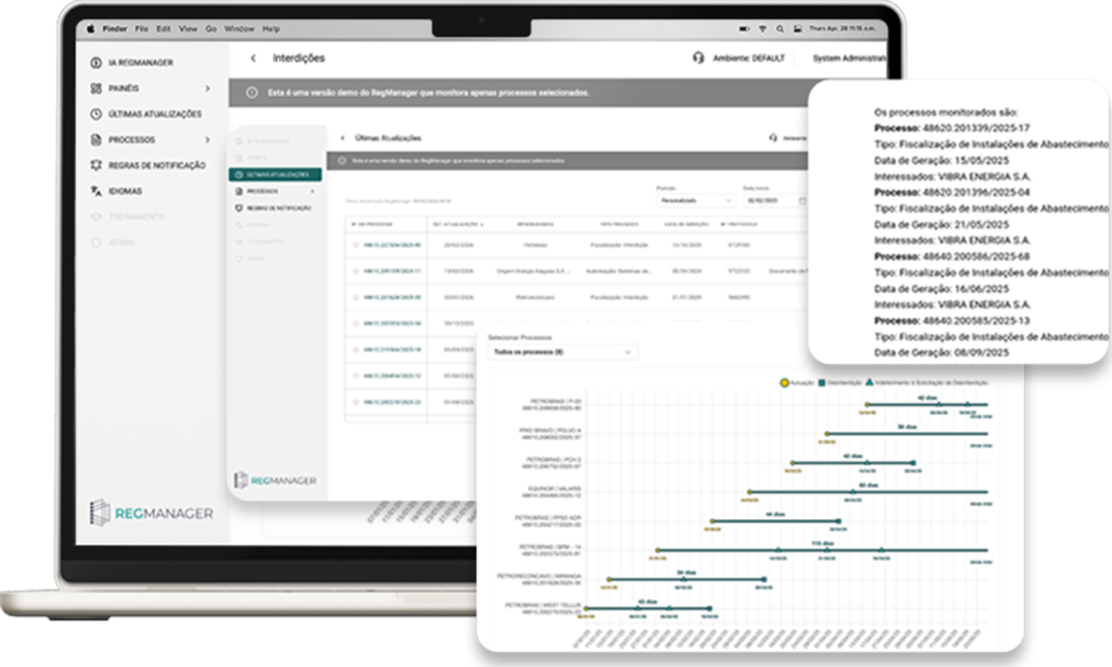 • Cloud 24/7 (web + mobile) para múltiplos usuários • Timelines interativas e dashboards gerenciais • Notificações diárias com resumos da IA RegManager